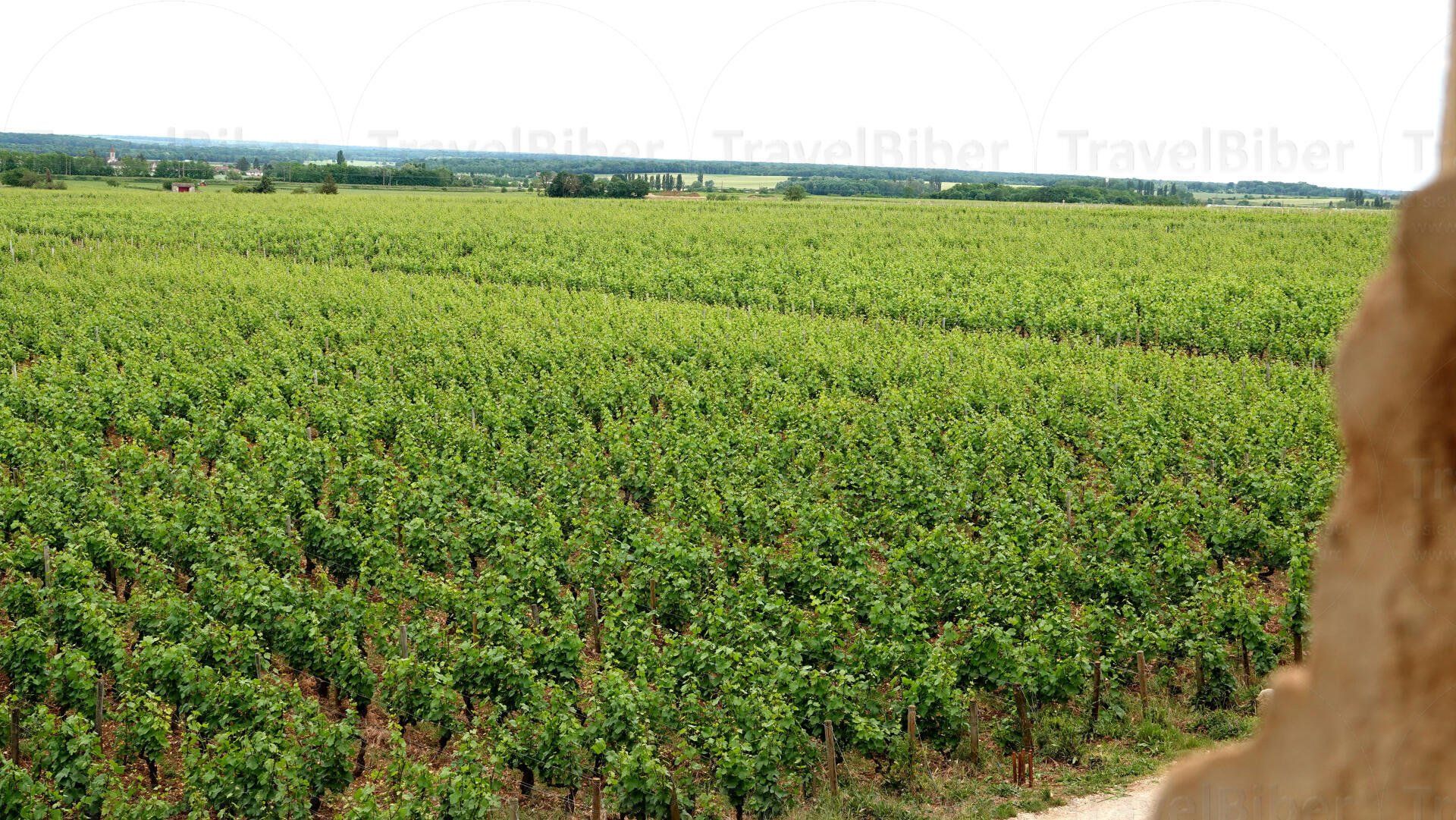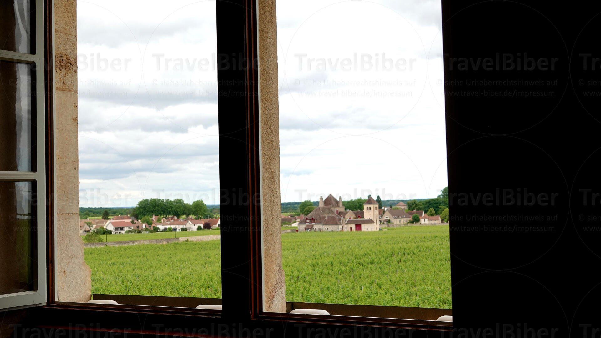 Blick aus dem Fenster auf die umliegenden Weinreben des Château du Clos de Vougeot.
