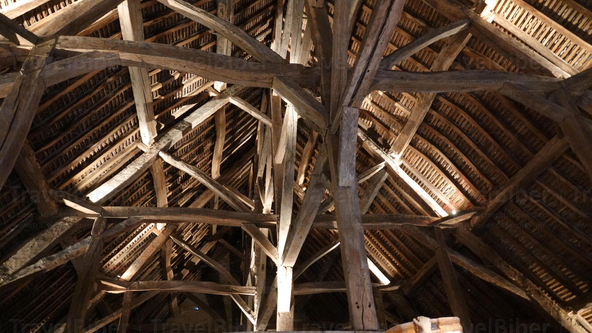 Altes Gebälk im Château du Clos de Vougeot. Hier ist ein kleines Museum untergebracht.