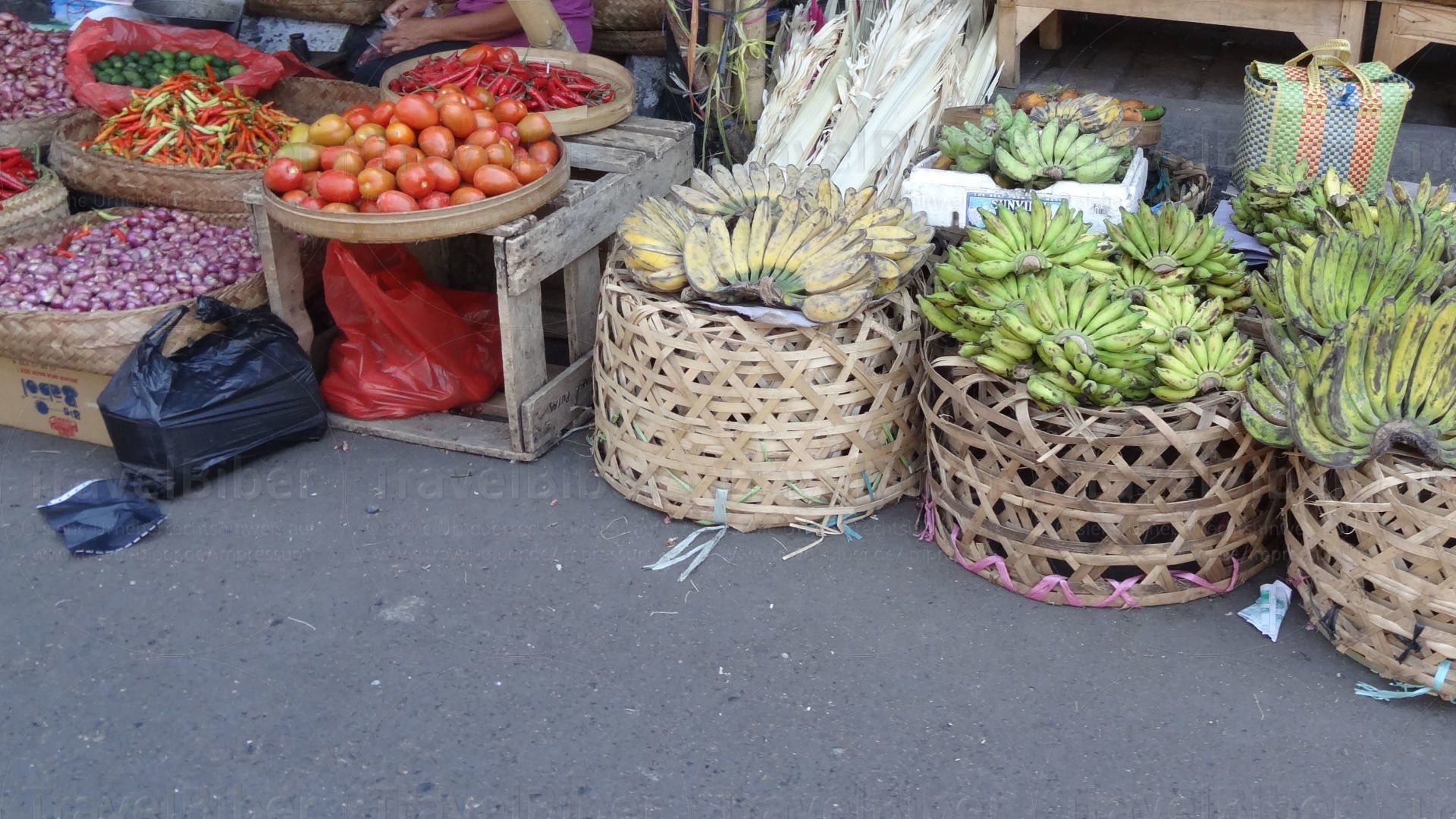 Buntes Gemüse und Früchte wird rund um das Marktgebäude zur Straße hin verkauft.