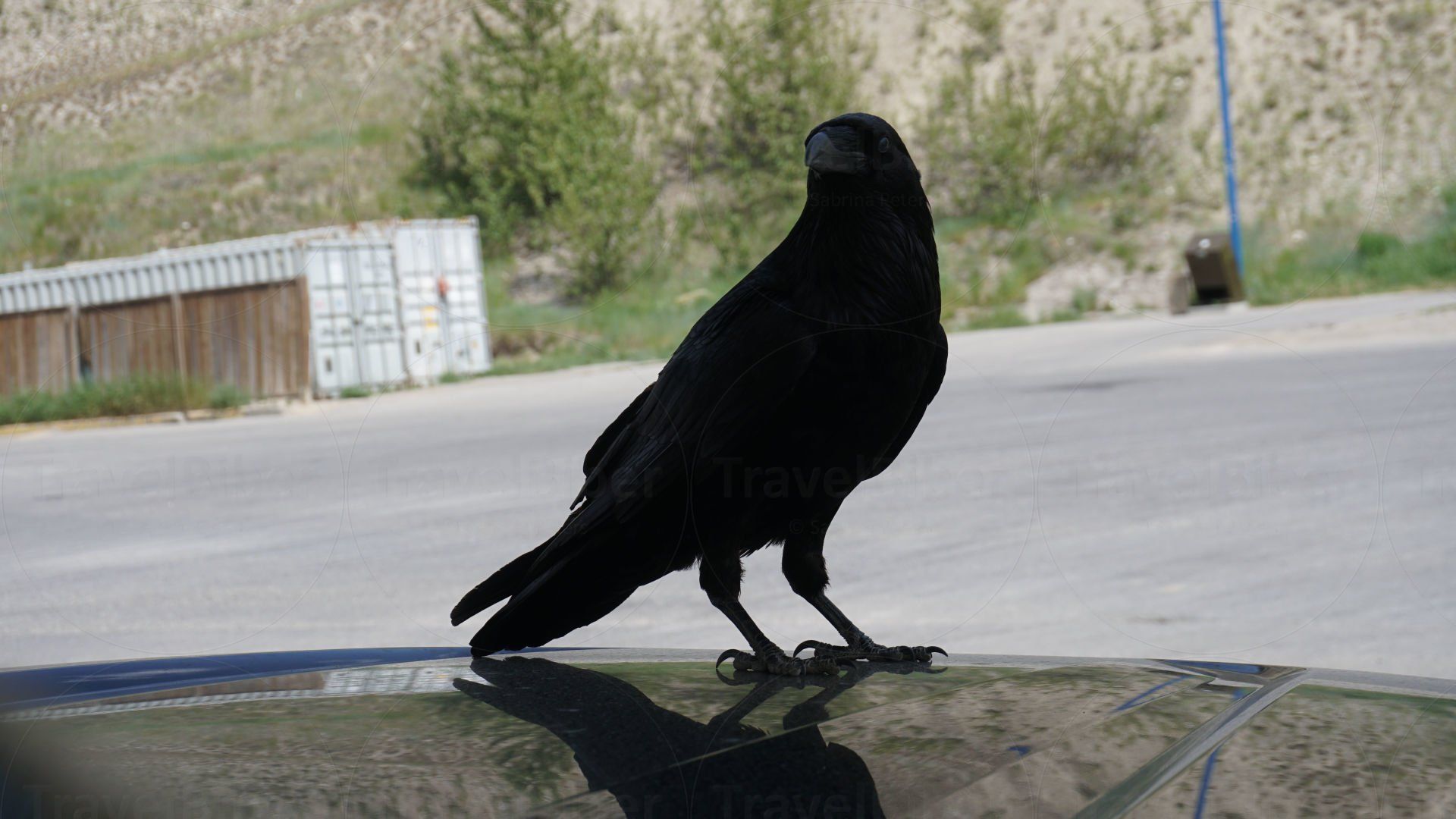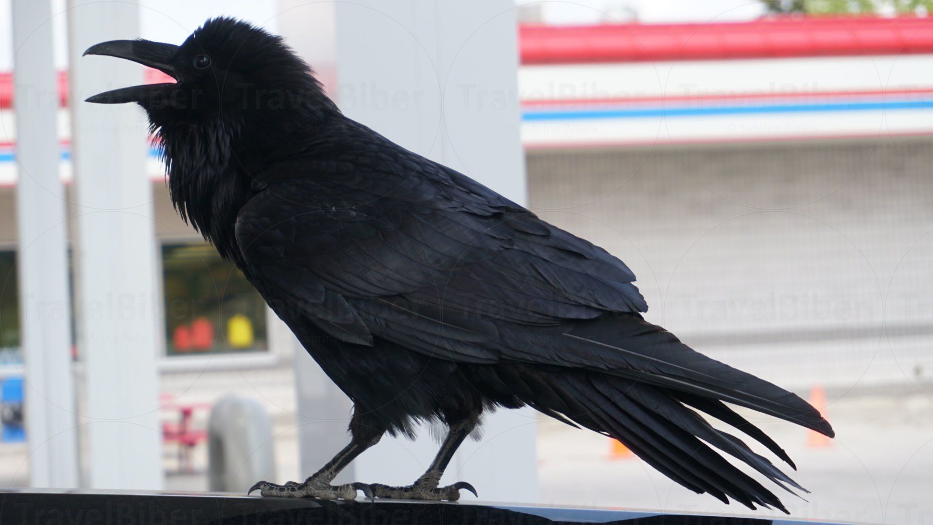 Besuch vom Raben an einer Tankstelle in Golden, hat sich einfach auf die Motorhaube des Truck-Campers gesetzt und laut gegröllt, wollt wohl sagen "das ist mein Revier".