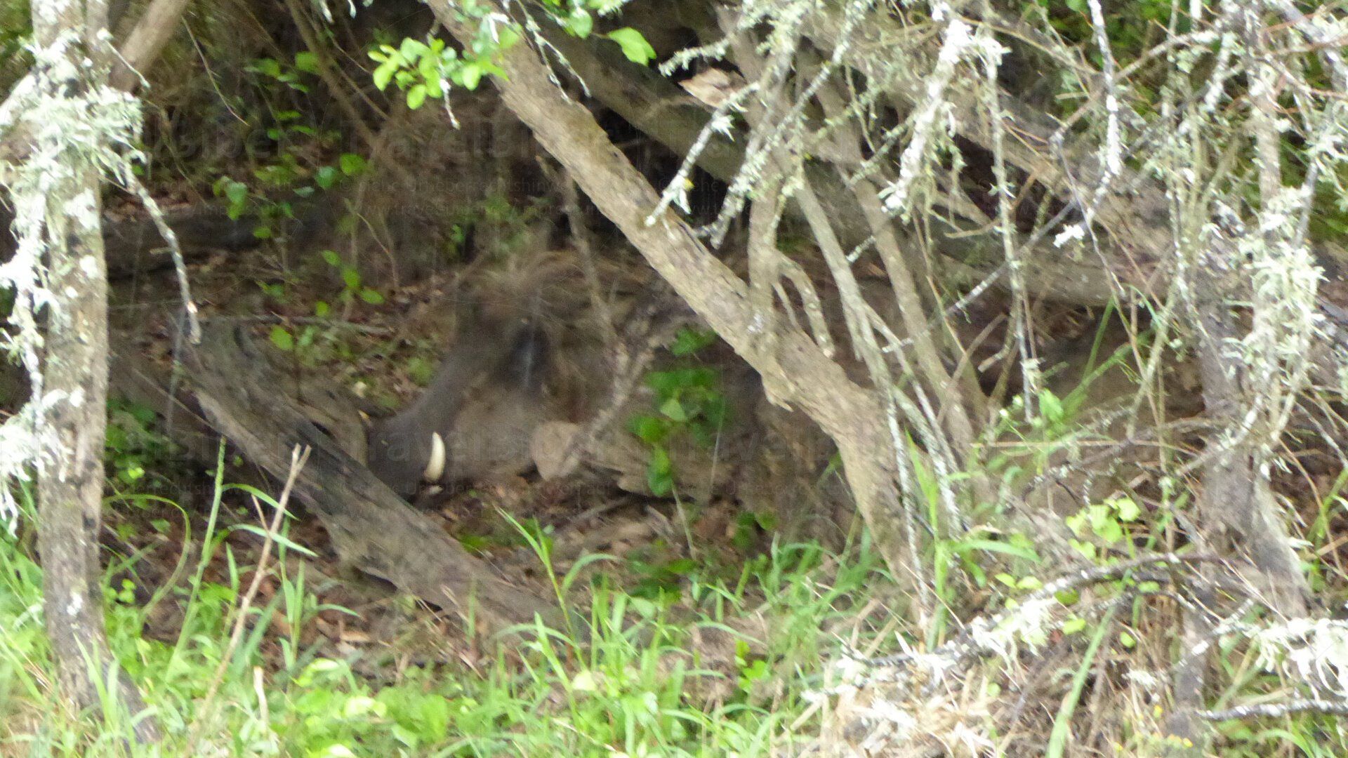 Ein Warzenschweinkadaver im Gebüsch versteckt, vermutlich vom Löwen erlegt und dort versteckt.