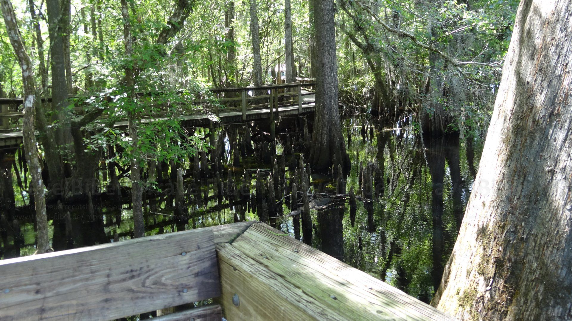 Unter dem Holzsteg befindet sich flaches Wasser, durchzogen von Wasserpflanzen und Bäumen. Am Ende des Steges kommt man am Suwannee River