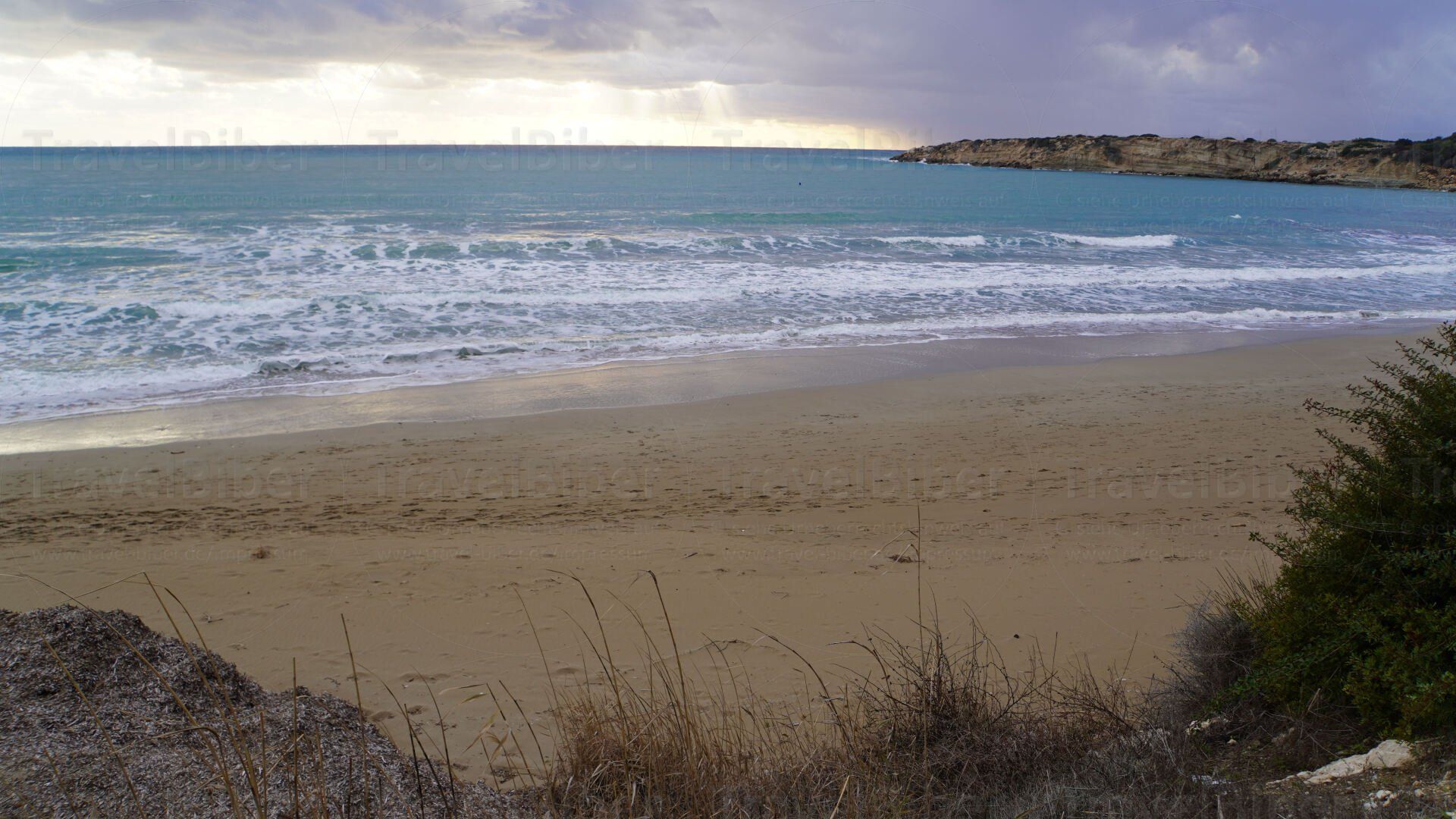 befindet sich der vermutlich im Sommer völlig überlaufende Strand mit dem berühmten Felsen der Aphrodite, hier früh morgens und aus der Ferne zu sehen.
