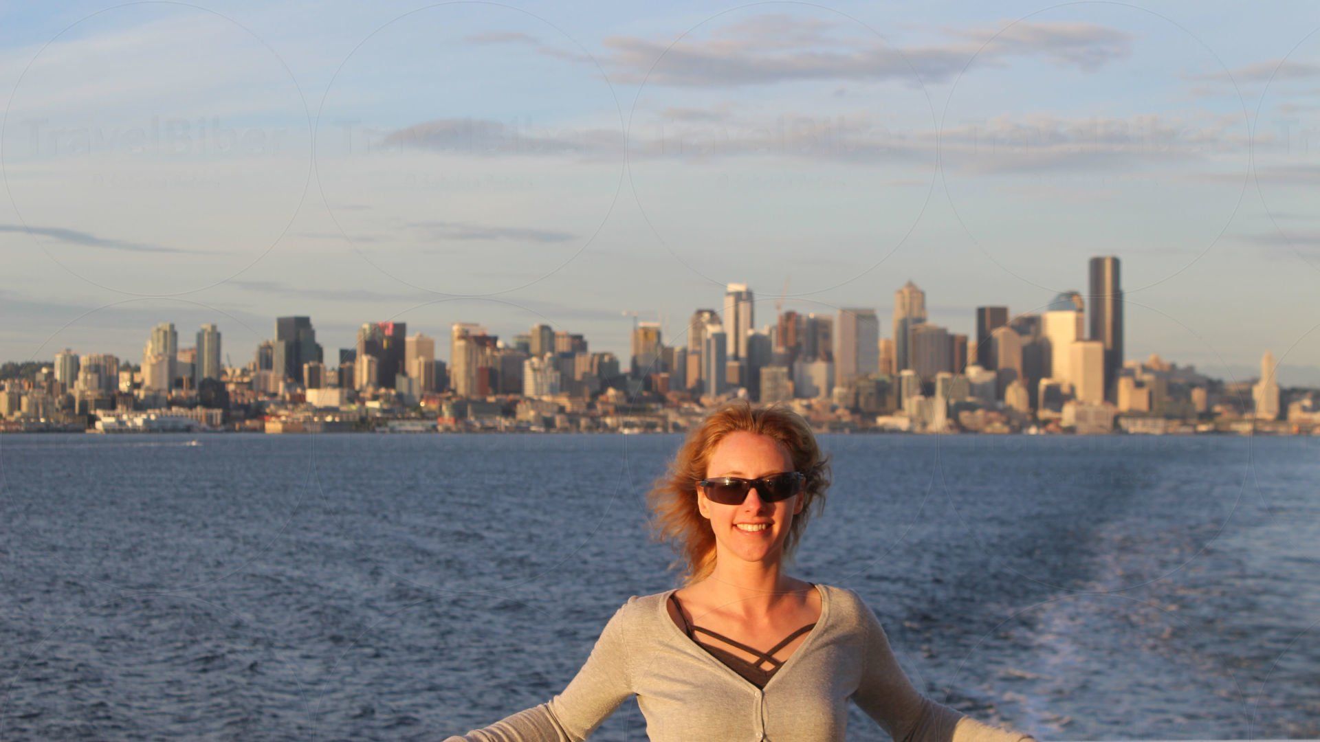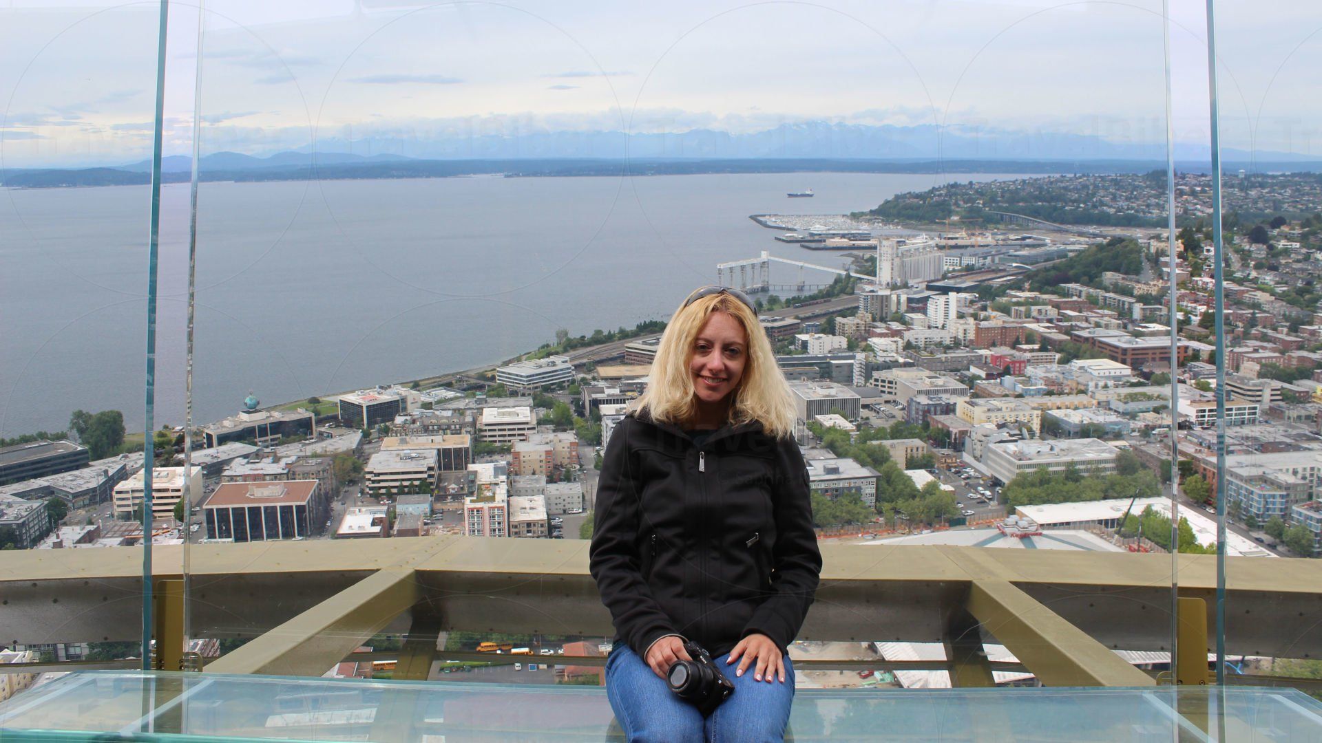 und dahinter Hafen und Meer von Seattle.