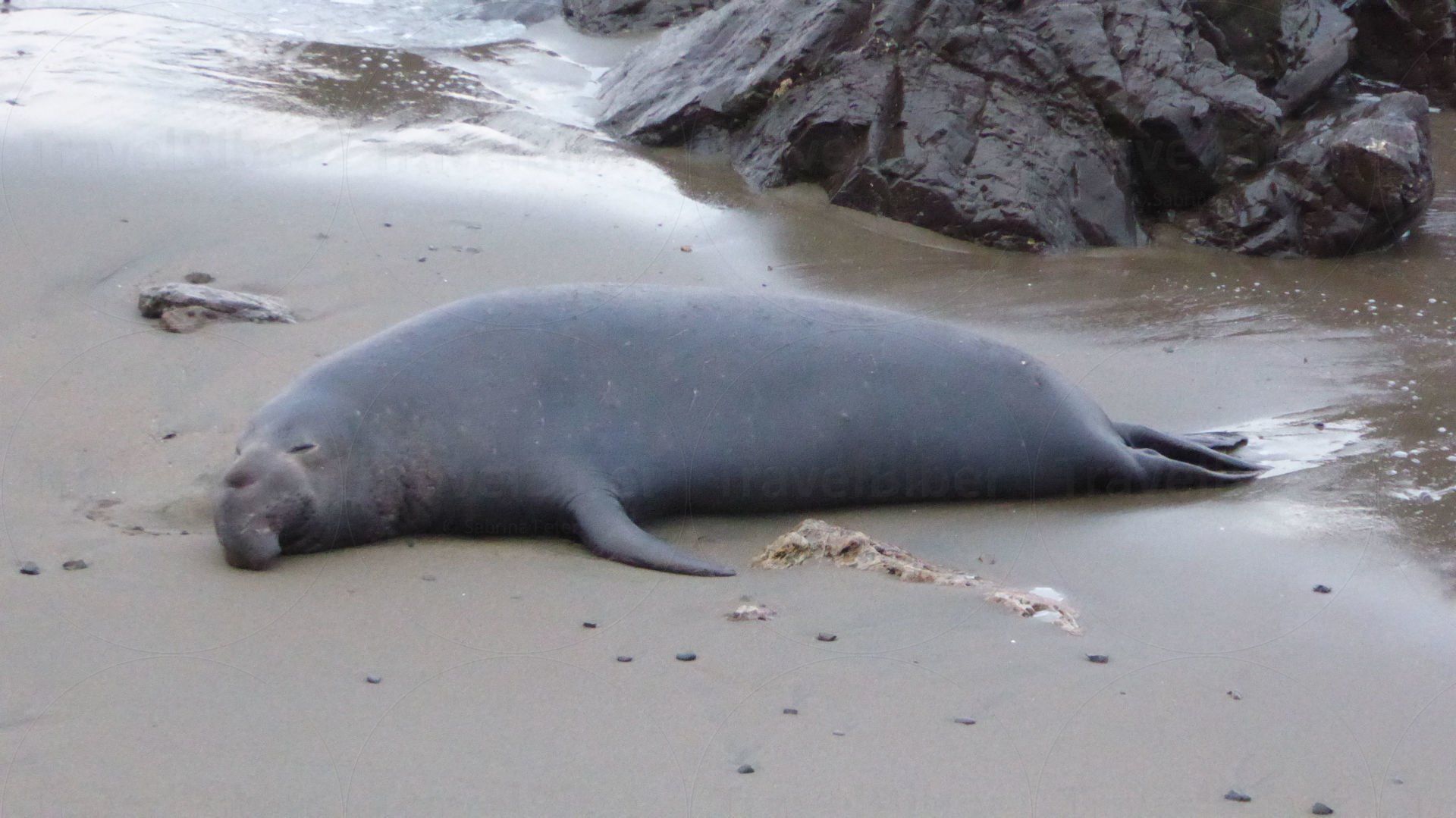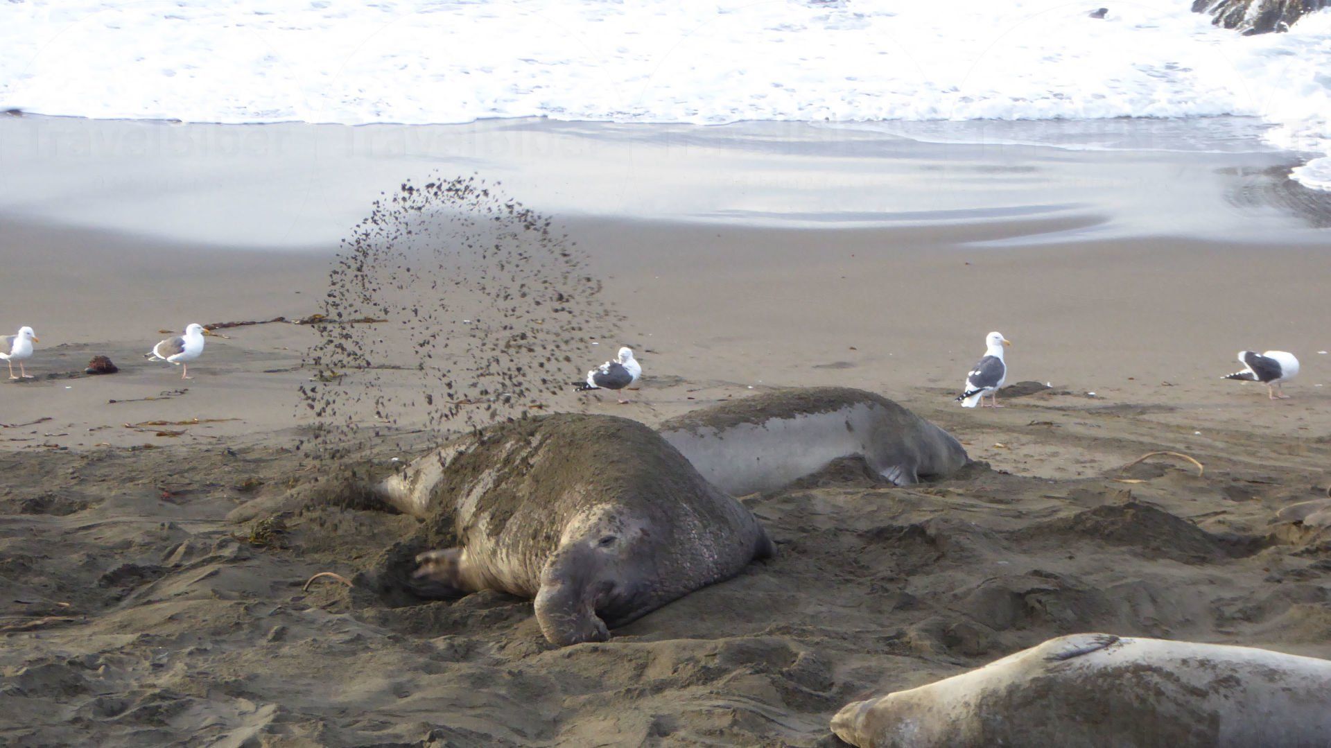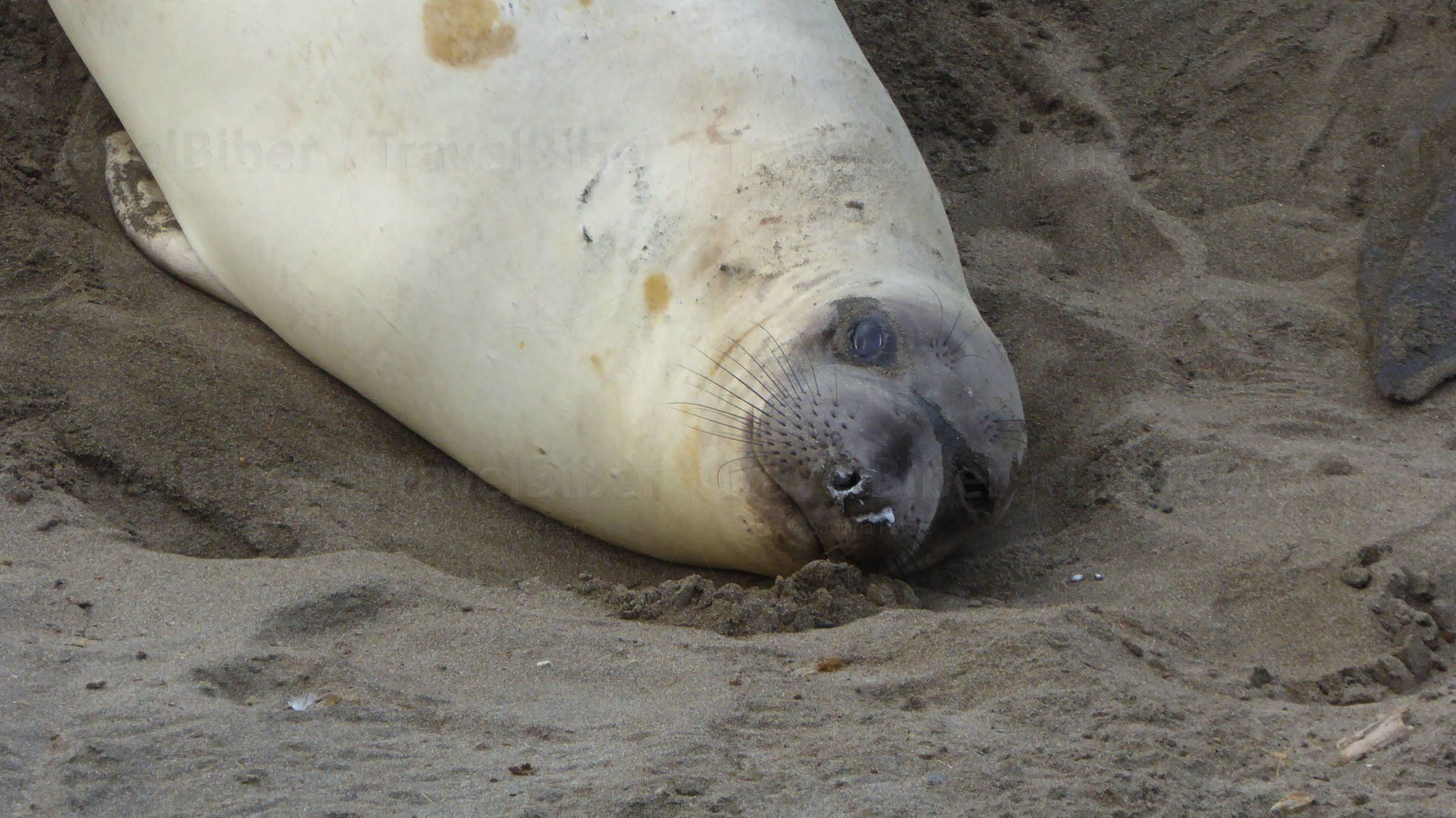 Der Seeelefantenbulle buddelt am Strand. Das sah sehr lustig aus.