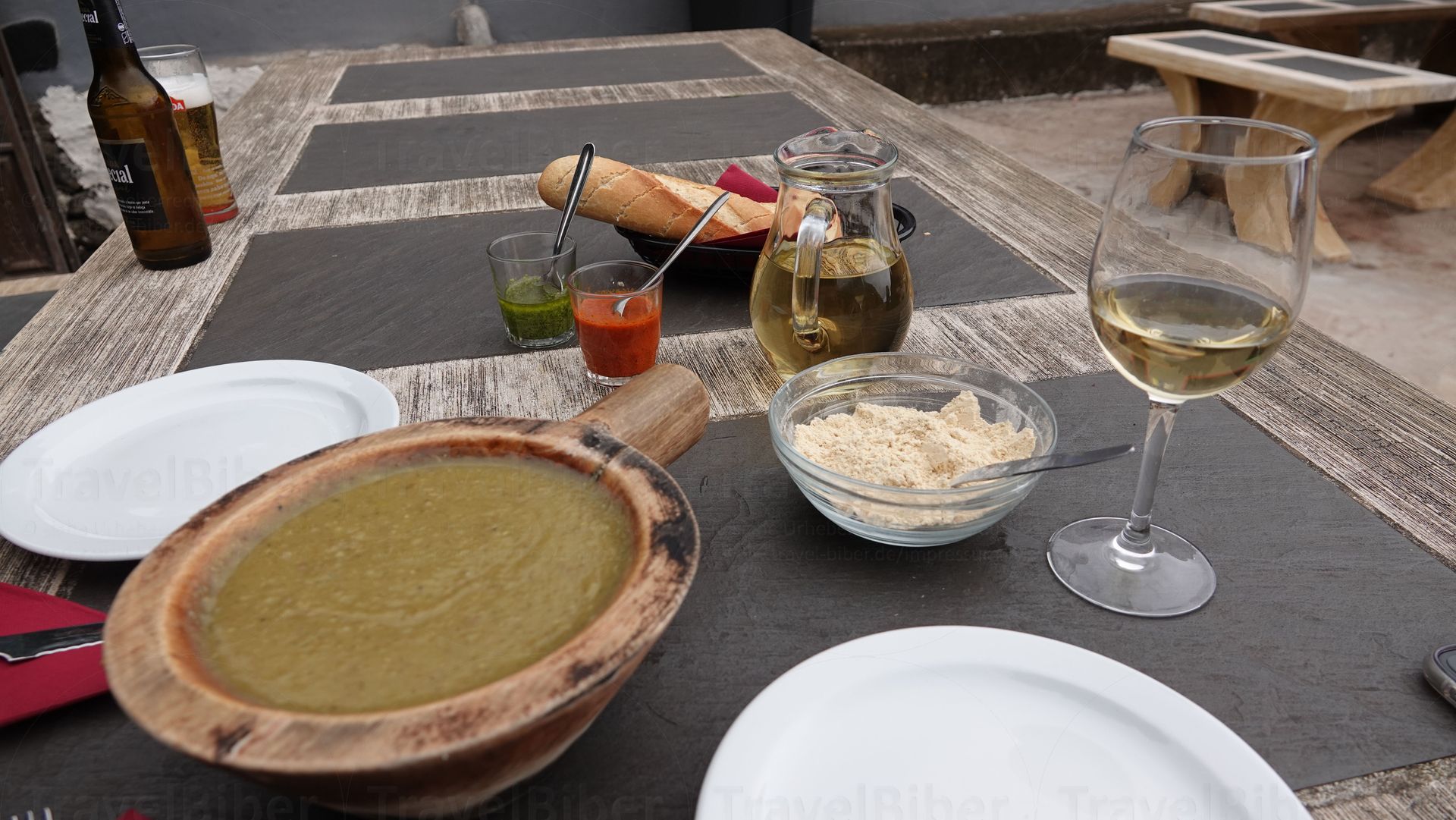 In der Bar muss man die berühmte Kressesuppe im Holznapf essen. Dazu gibt es Gofio und Hauswein sowie Mojo.