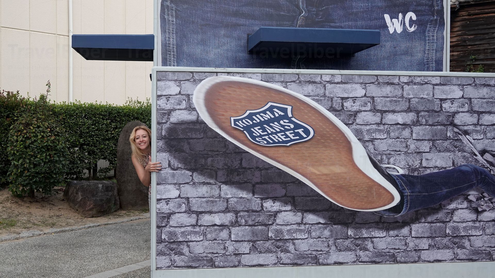 Schon am Bahnhof wird man mit Jeans begrüßt.