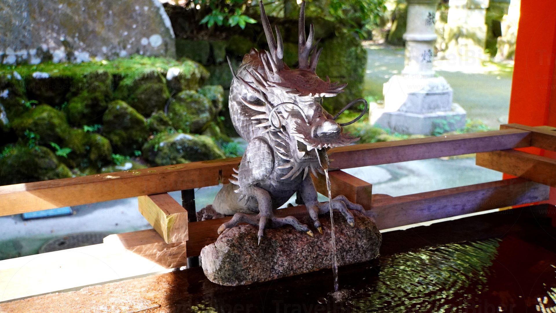 Moosbewachsene Statue am Hakone-Schrein.