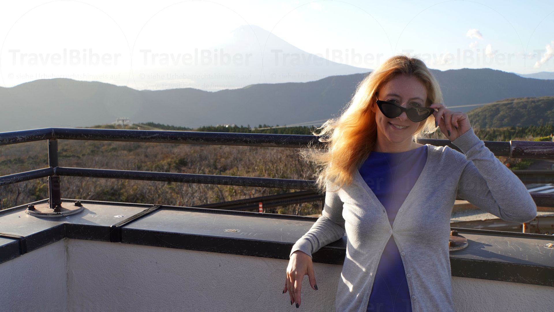 Owakudani Station. Die Sonne geht unter, der Fuji versteckt sich hinter Dunst.