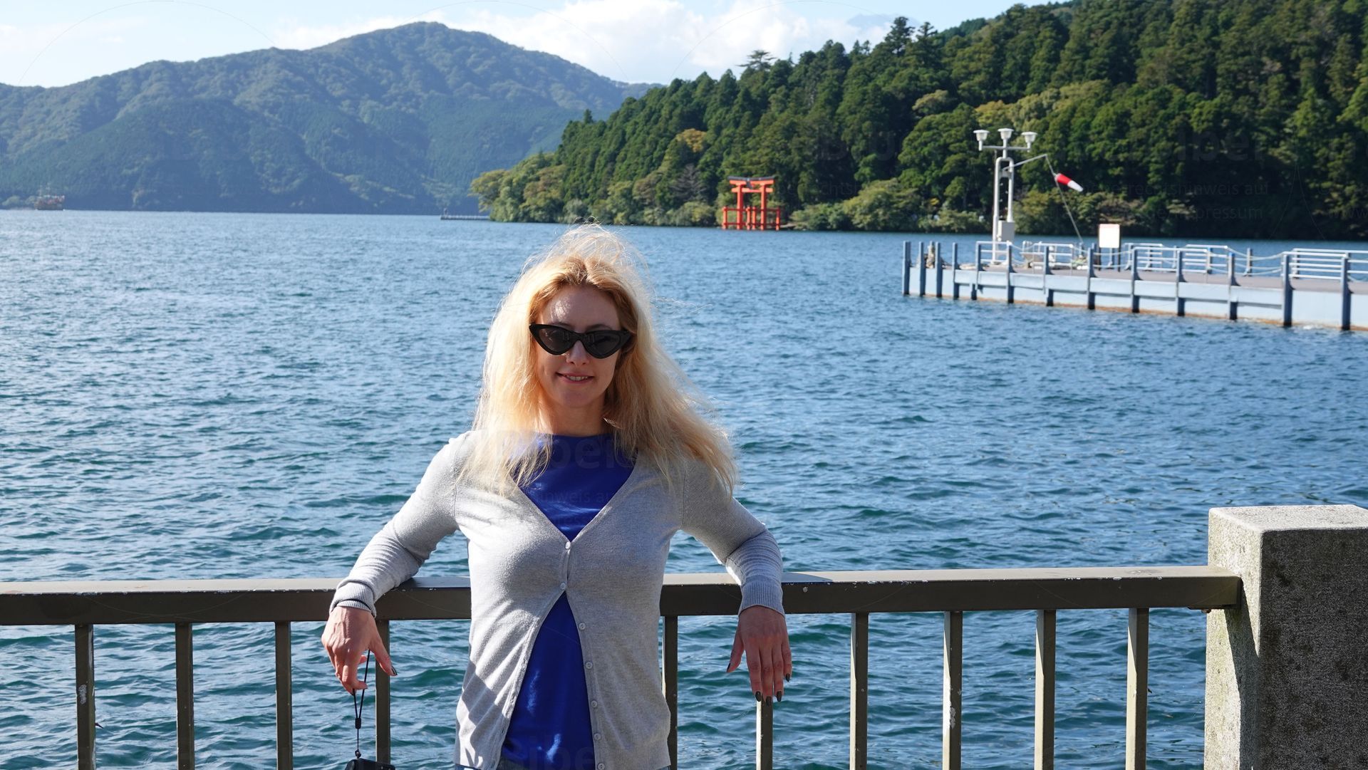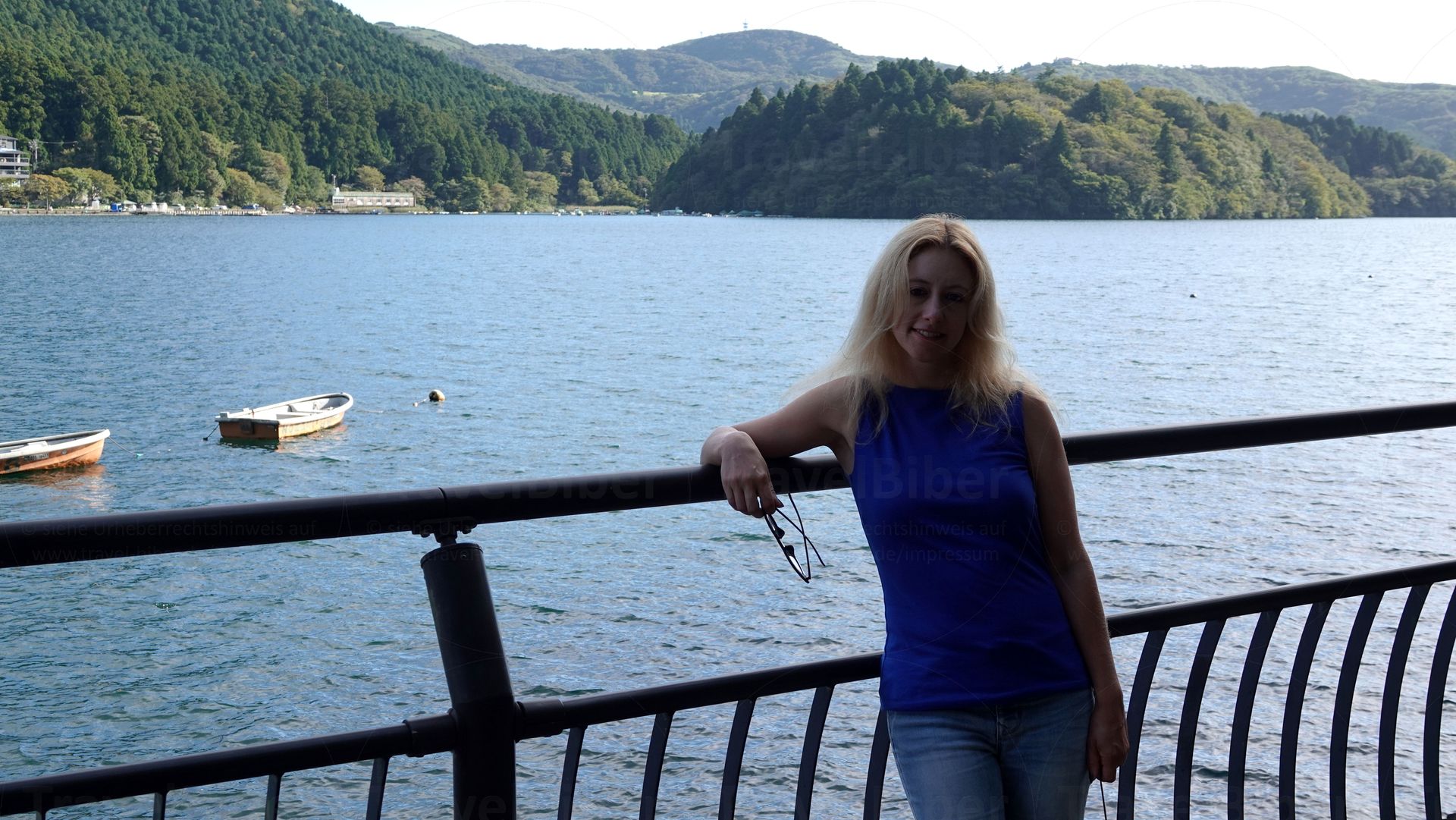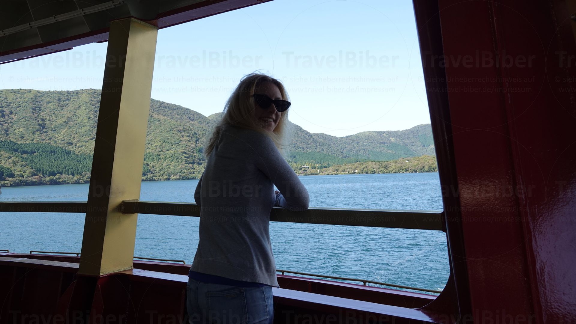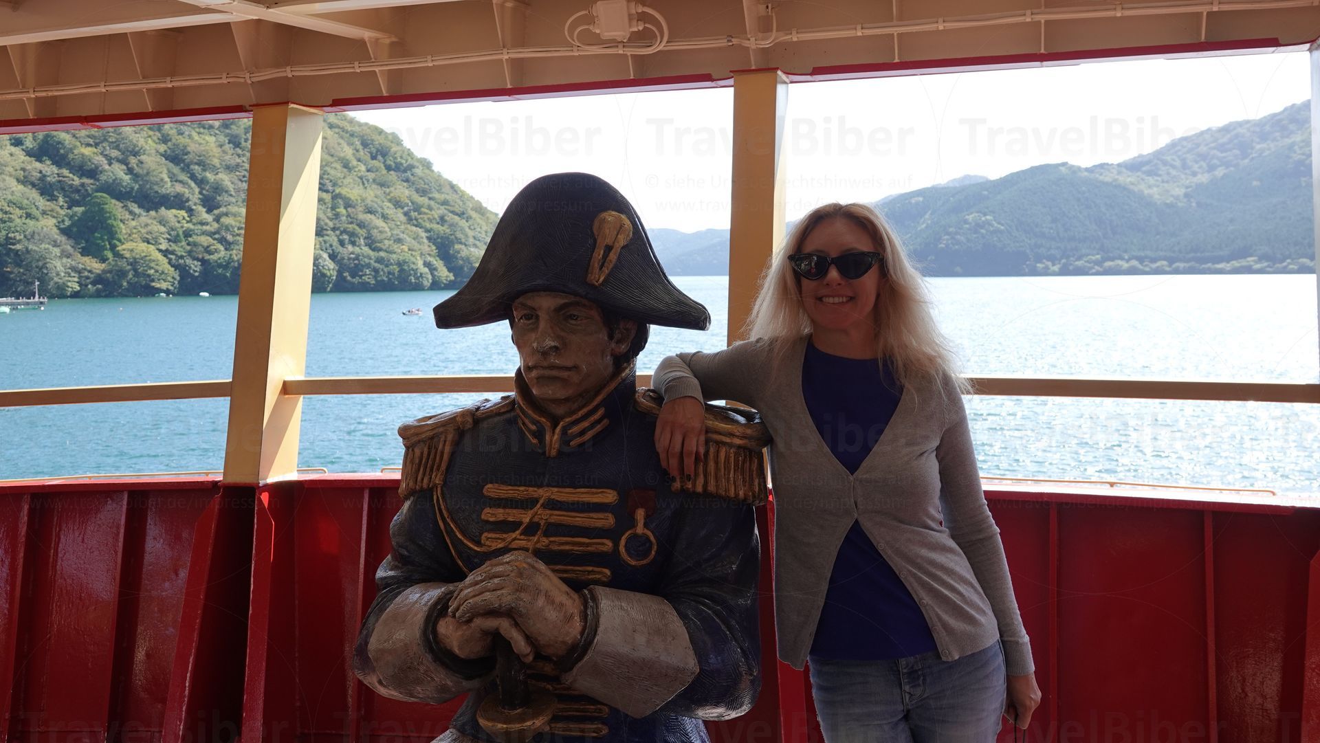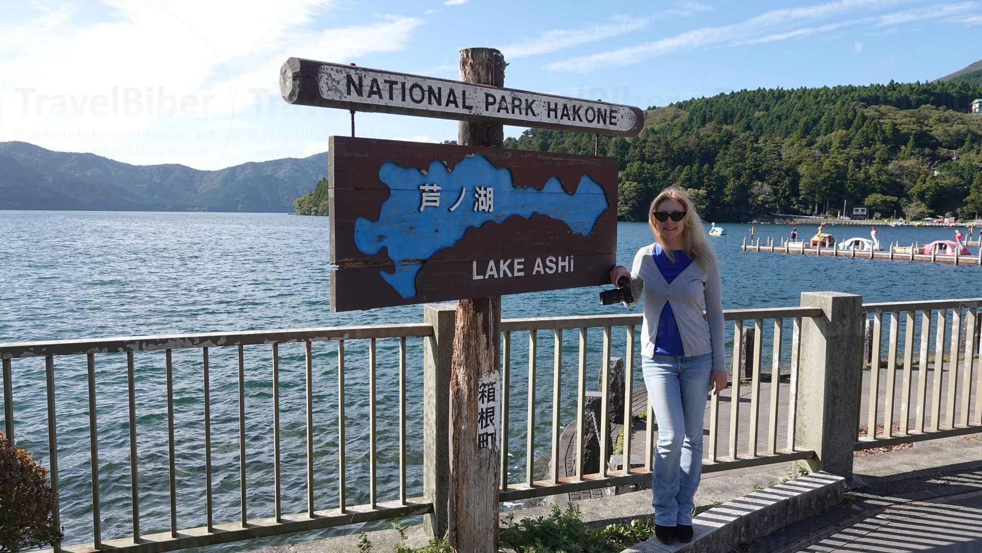 Am Ashi-See. Hinter mir das Schiff, mit dem es nun weiter geht.