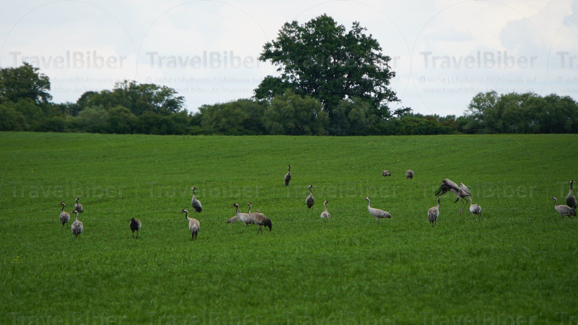 Kraniche auf einer Wiese.