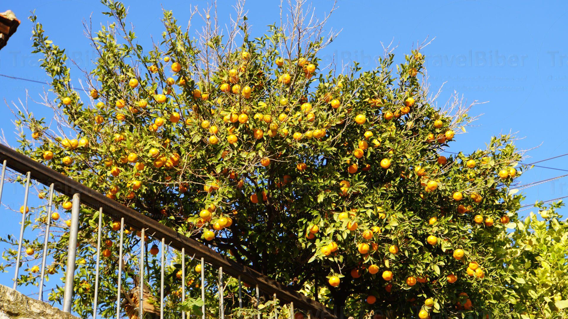 Wunderschöne Orangenbäume im Ort Kalavasós. Im Dezember sind die Bäume voller Früchte.