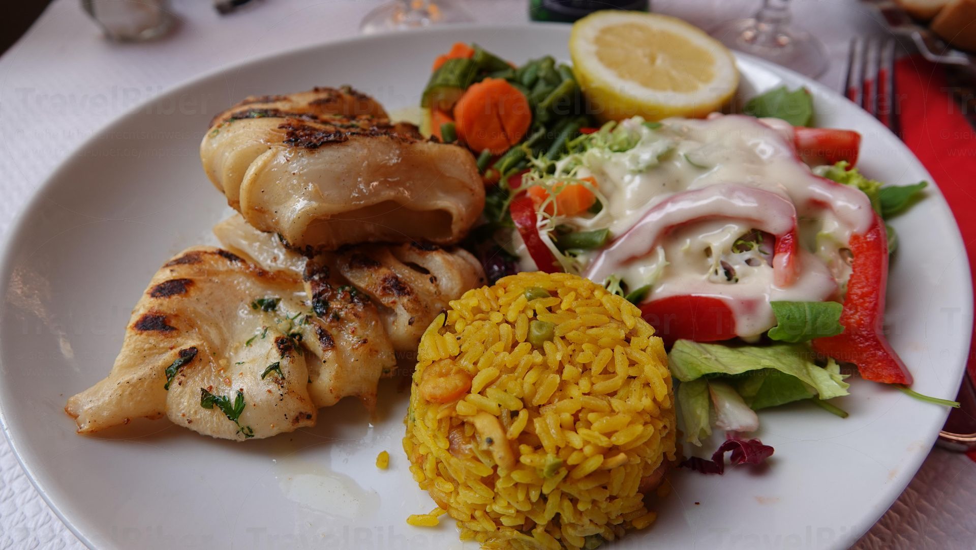Es gibt gegrillten Tintenfisch mit Salat und Reis.