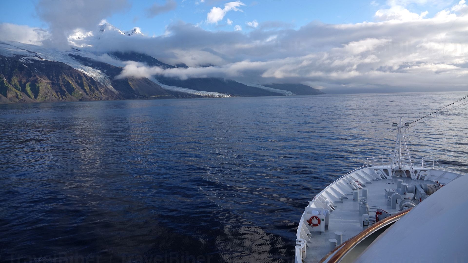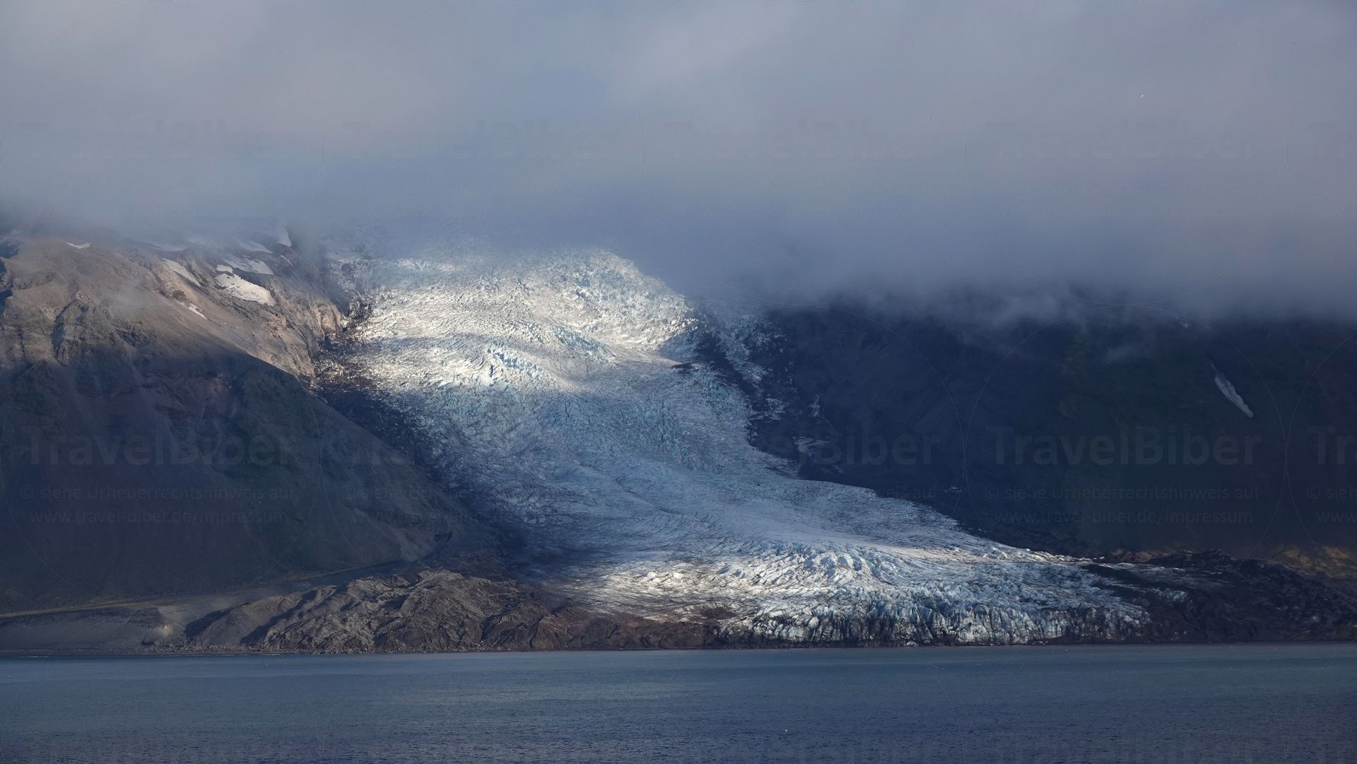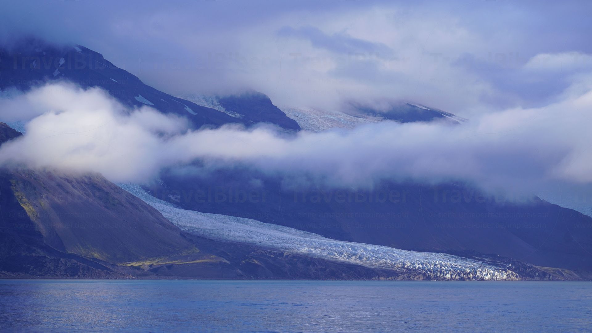 Neben dem mächtigen Gletscher ist der schmale Teil der Insel sehr grün.