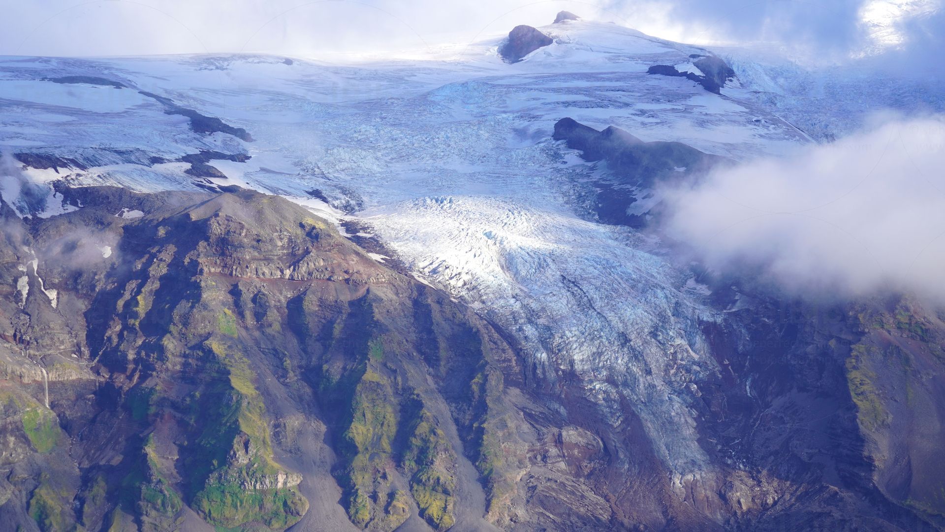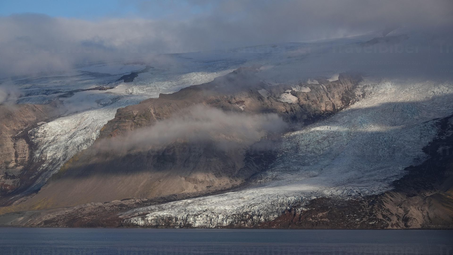 Von der Mitte aus geht ein riesiger Gletscher in mehreren Ausläufern runter bis ans Meer.
