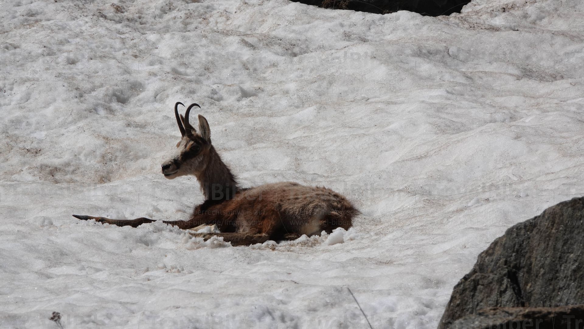 Auch Gämsen gibt es hier. Diese kühlt sich gerade im Schnee ab.