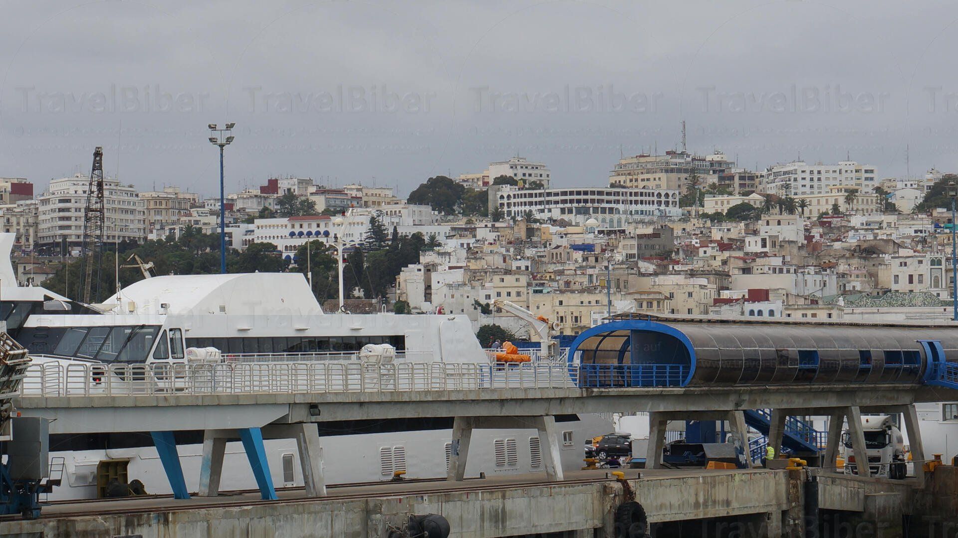 Blick vom Hafen aus auf die Stadt Tanger, vor Abfahrt mit der Fähre zurück nach Tarifa.
