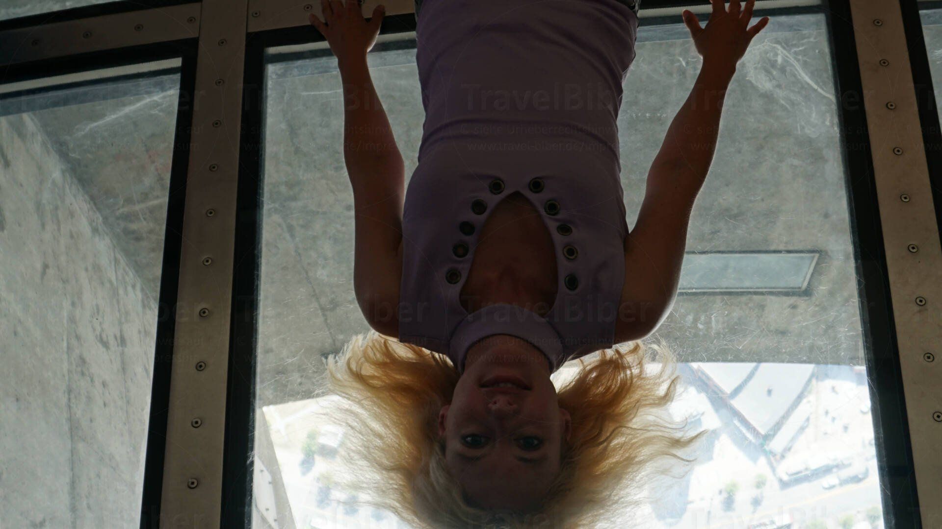 Ein Aufzug mit gläsernem Aufzugboden bringt einen nach oben; da muss man schwindelfrei sein. In wenigen Sekunden ist man oben.
