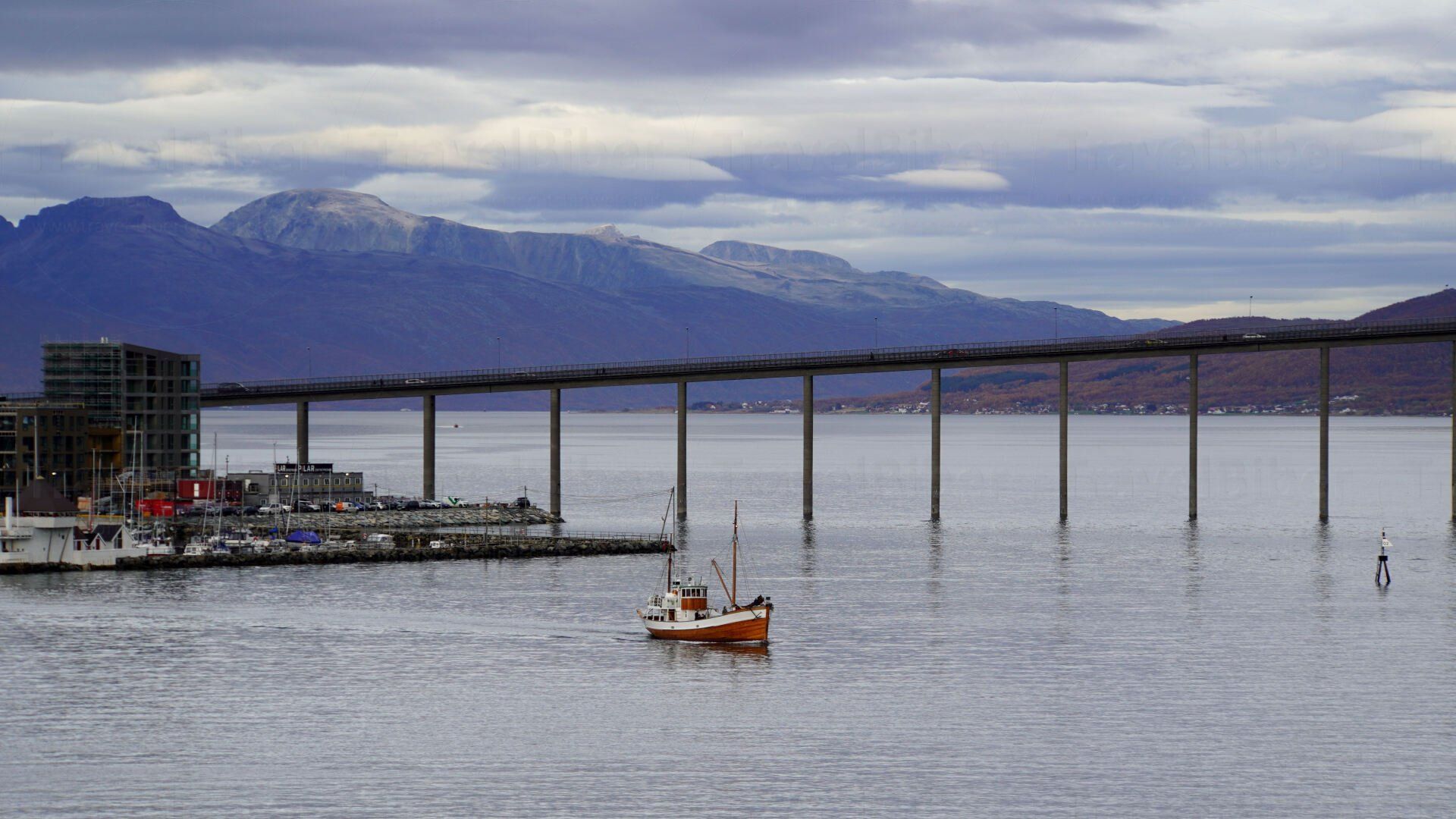 Das Postschiff hält rechts der Brücke im Hafen. Dann geht es zu Fuß über die Brücke zur berühmten Eismeerkathedrale,