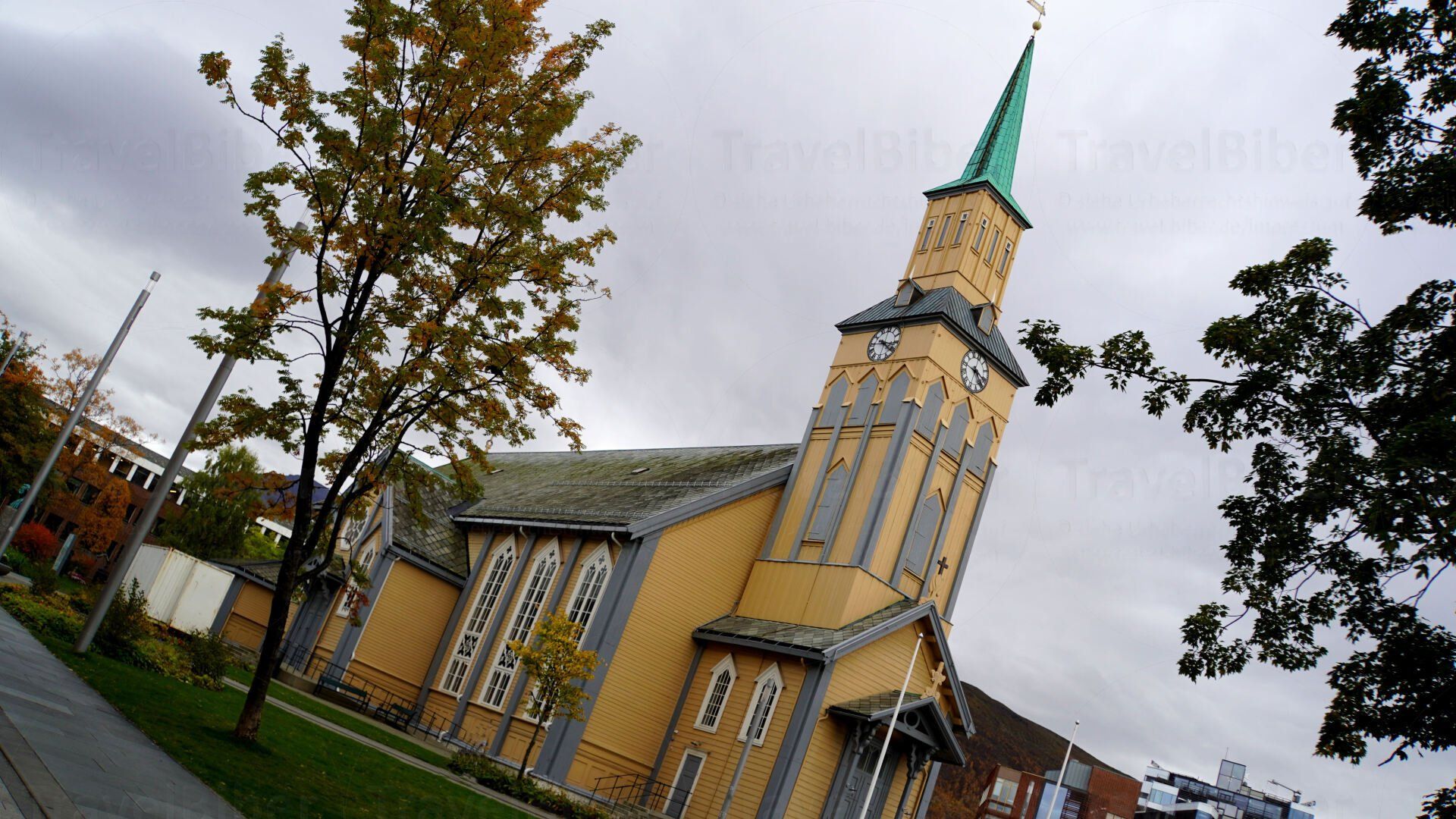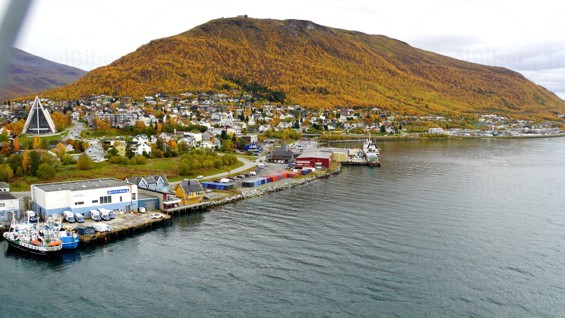 mit Blick auf den Hafen und dahinter die berühmte Eismeerkathedrale.