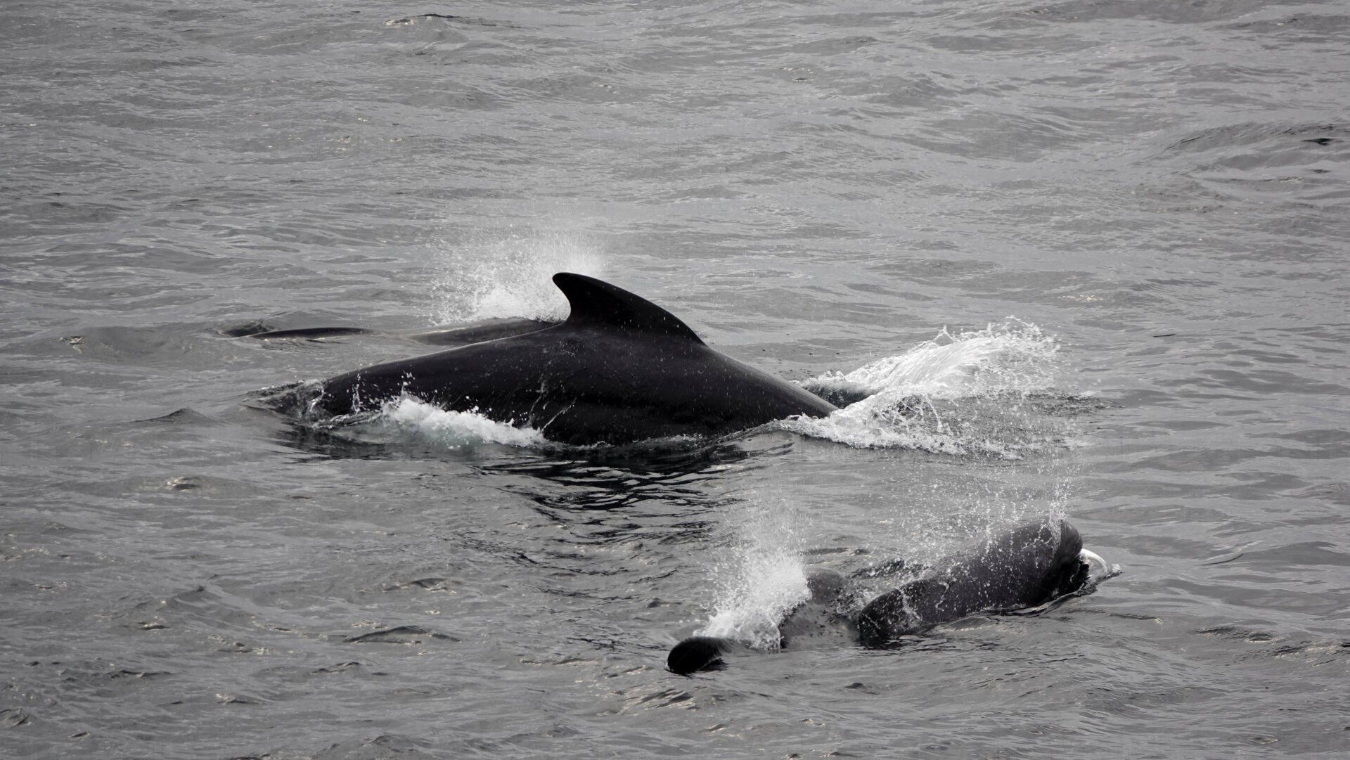 Dann tauchen plötzlich Pilotwale direkt beim Schiff auf. Sie scheinen gefühlt überall um uns herum zu sein, eine riesige Schule.
