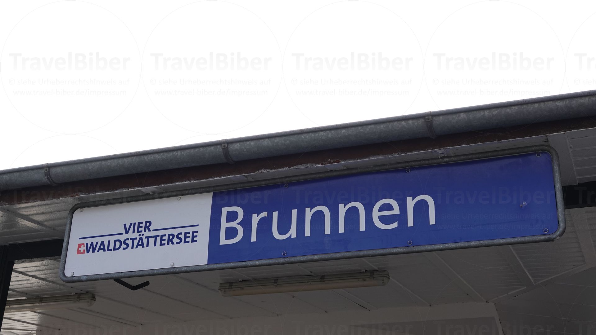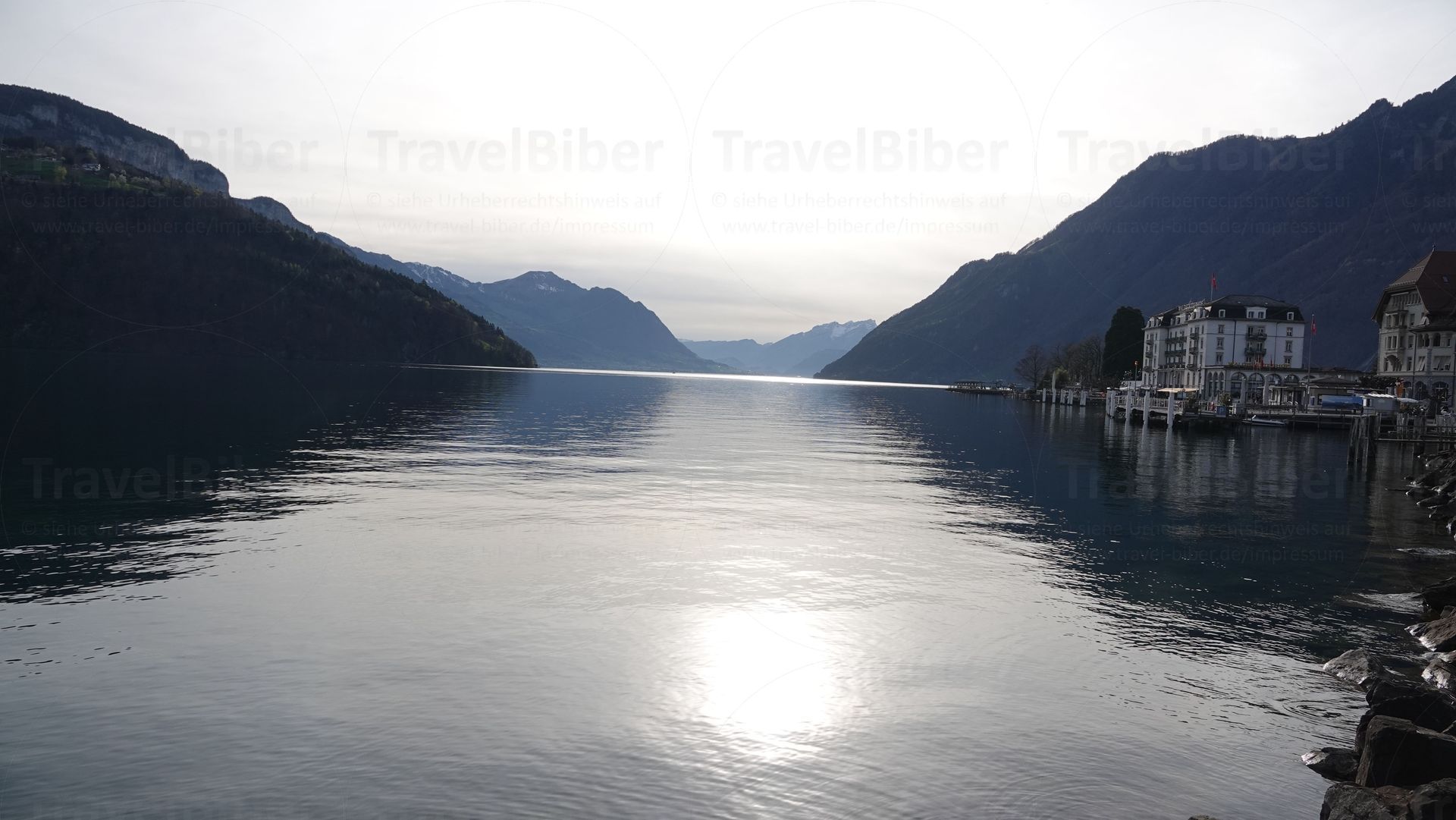 Nach Vitznau (Rigi-Bahnen) geht es weiter am See entlang, mit kurzem Stopp in dem Ort Brunnen, Anfang April 2024.