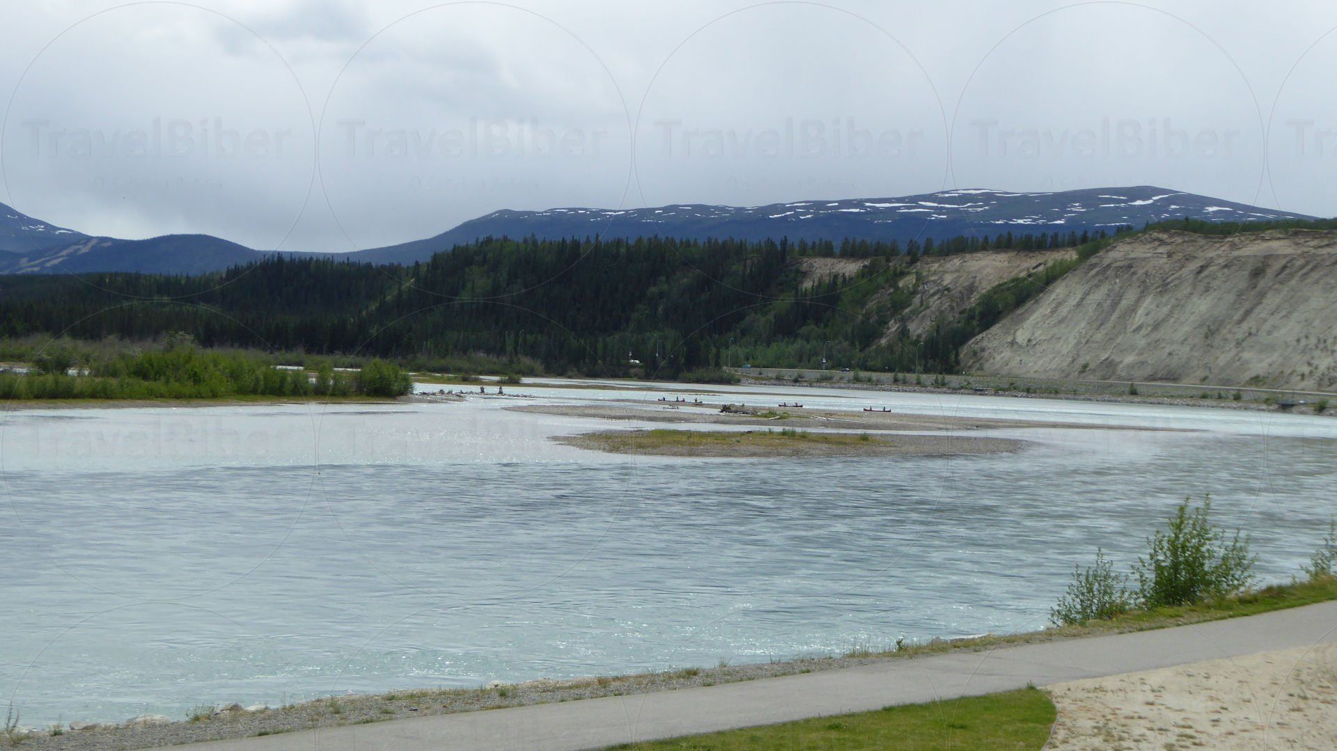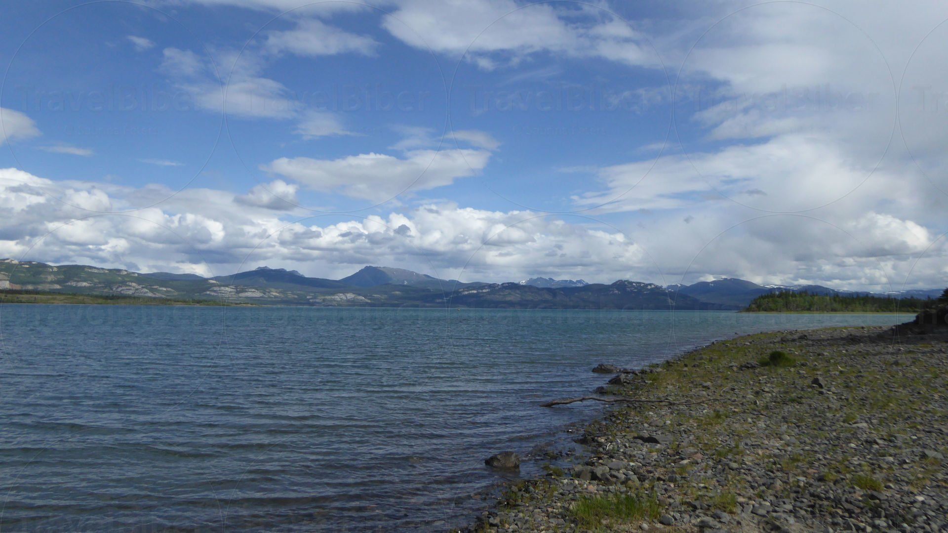 Vorbeifahrt am langgezogen Laberge Lake, durch den der Yukon River